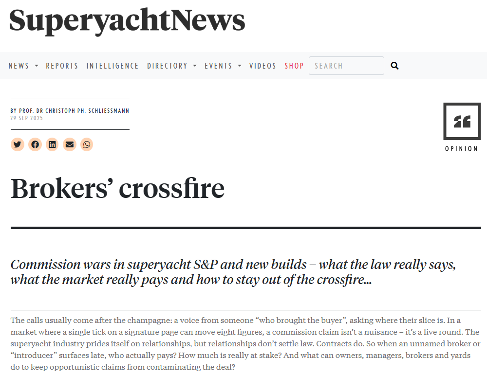 Im Neubau verschiebt sich das Bild nochmals. Führende Werften – exemplarisch Benetti – verankern eine Provision (keine Doppelvergütung), zahlen pro rata zu Meilensteinraten und stellen klar, dass „casual introductions“ oder bloße Namensregistrierungen keinen Anspruch begründen. Verlangt wird eine substantielle Mitwirkung am Deal. Diese Policies haben in der Praxis einen spürbaren Filtereffekt gegen dünn belegte „Introducer“-Forderungen.